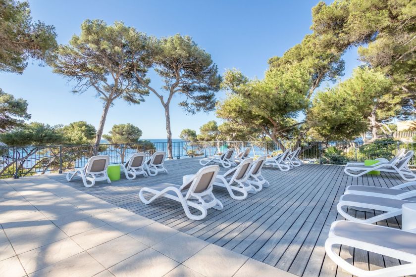 Das Clubhotel ist wie direkt am Meer gelegen und hat direkten Zugang zu einem schönen Kieselstrand. Ein Sandstrand ist in nur 20 Minuten zu Fuß erreichbar. Das Gebäude fügt sich in die natürliche Umgebung ein und die Terrasse des Restaurants blickt auf das Meer. Man fühlt sich wie auf einer Kreuzfahrt.