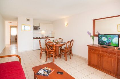 "Un appartement calme bien agencé et bien équipé, avec une terrasse couverte agréable et un espace vert privatif appréciable. La piscine et le golf sont à proximité."